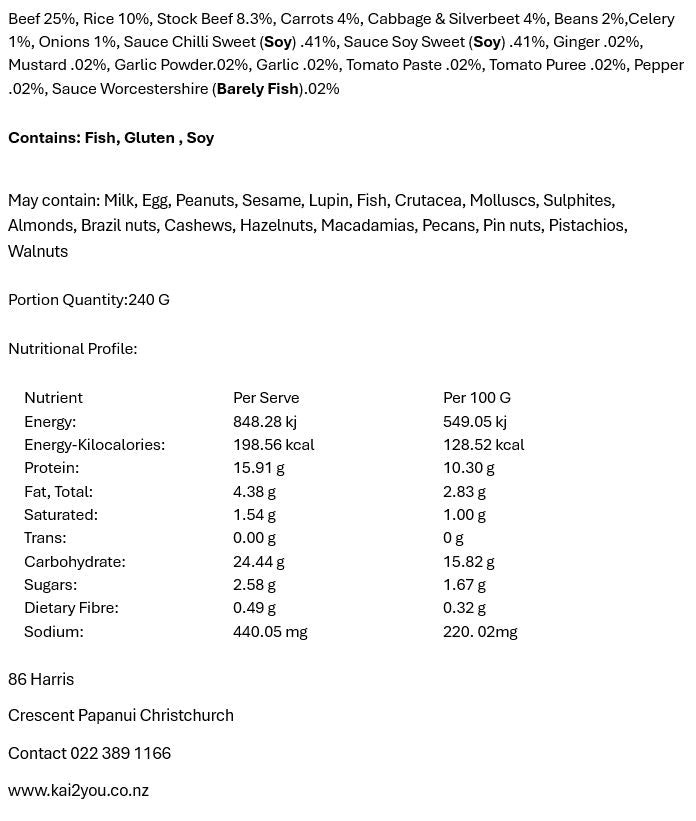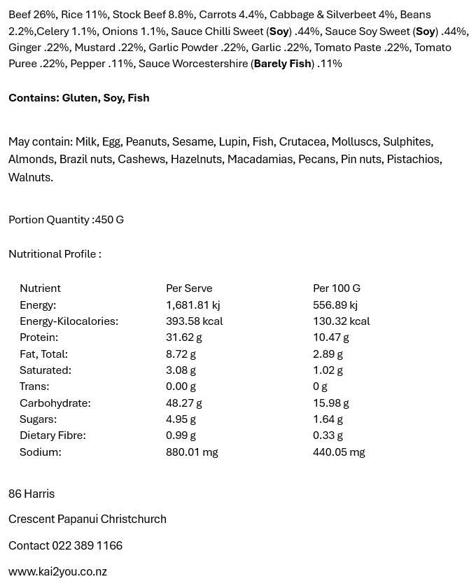 Slow cooked Asian beef casserole with steamed rice, carrots and greens
