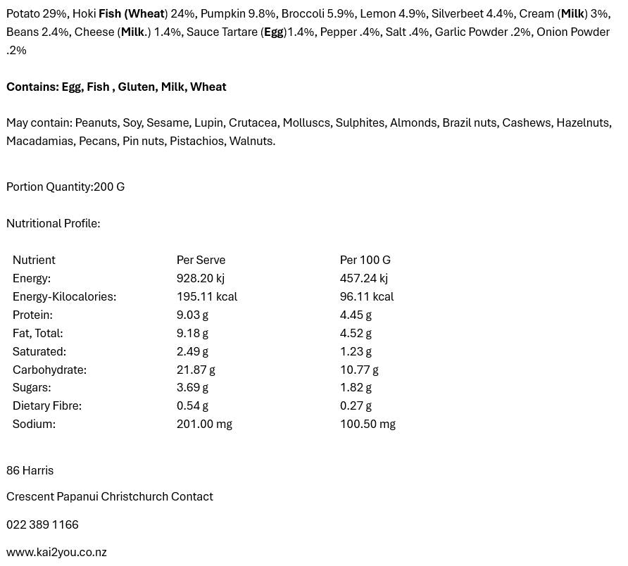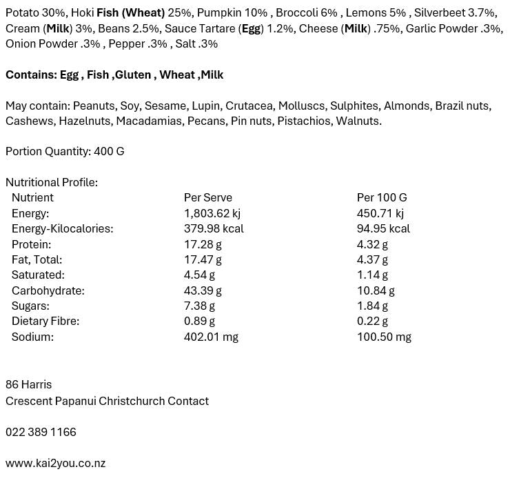 Crumbed fish with a lemon wedge, tartar sauce, potato bake, pumpkin and fresh greens