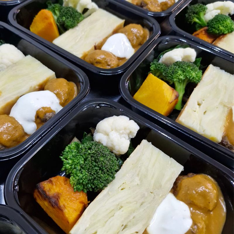 Greek style lamb meatballs with gravy, mint yogurt, potato bake, pumpkin and greens