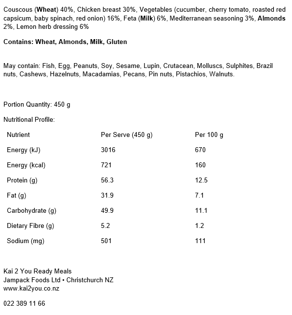 Fresh and full of flavour. Tender chicken breast paired with fluffy couscous, vegetables, herbs, and a light Mediterranean-style dressing. A wholesome summer salad that’s delicious cold and perfect for lunch or dinner.