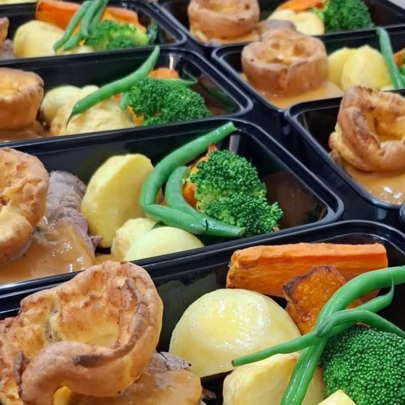 Roasted rump beef with yorkshire pudding, homemade gravy, mixed roasted vegetables and greens.