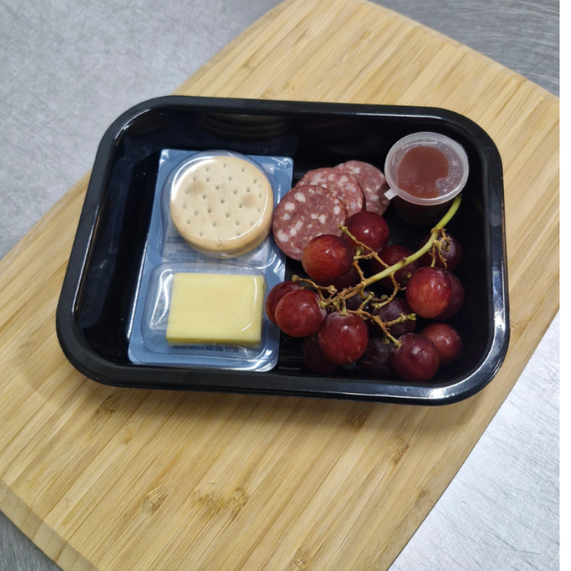 Get your mouth around some crackers, cheese, salami, relish and grapes.